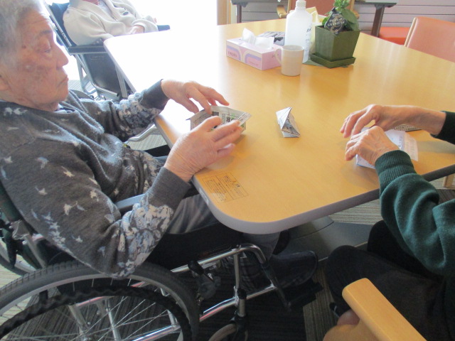 エプロンの次は新聞紙での箱作り。「あれ、どんだっけ?」とI様。K様も折り目を付けておりました。「なんさでも使えるね♪ちょっとした物でも入れるにいいな」と丁寧に作られていました。職員と楽しく会話をしながらの作業はいいですね^0^♪また一緒にお願いします^-^!
