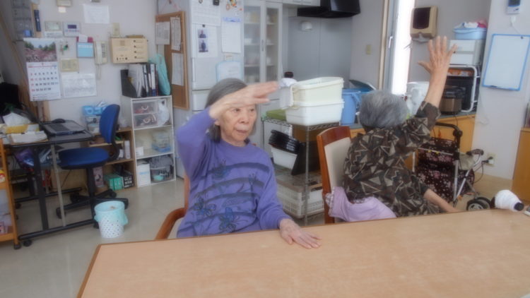 今日は、お茶会の前のテレビ体操の様子を、ご覧いただきます。