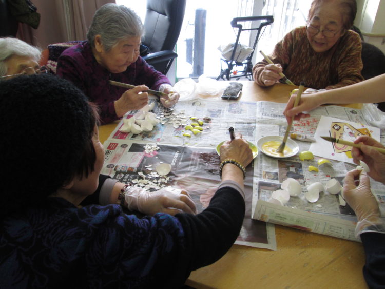 今日は昨日に引き続き工作レクを行いました。今日は昨日と違う色を練っていただきました。1回目に行った際、卵の殻を割ってから色付けしたため、塗りづらいとの声が聴かれました。その失敗をいかして、今回は殻を割る前に色付け行いました。皆様塗りやすかったようで、作業がいつもより進みました。