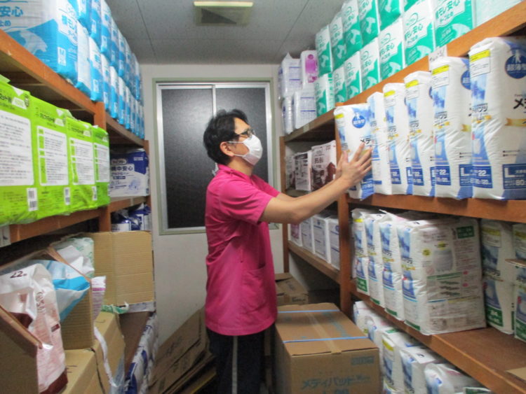 次に排泄物品の補充の仕事をしている様子です。(↑写真)こちらはお客様が毎日使用される物なのでなくなら無いように、定期的に補充を繰り返しています。