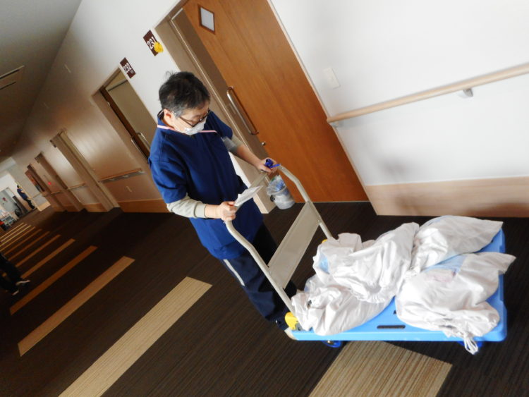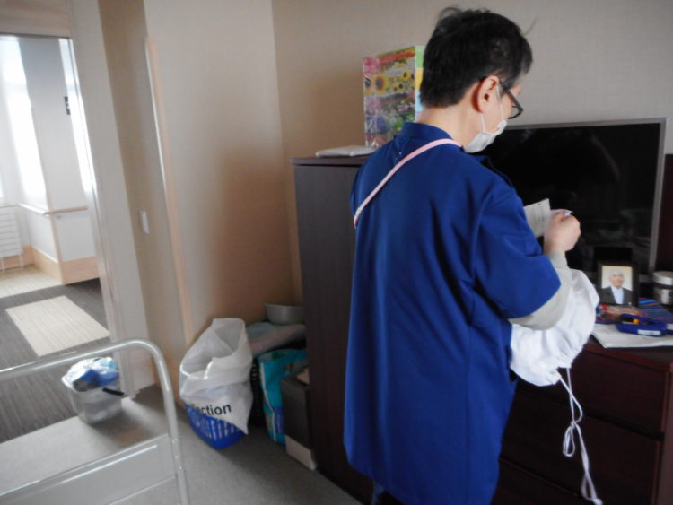 写真は業者に洗濯物を出しているお客様の衣類を各居室に戻している様子です。