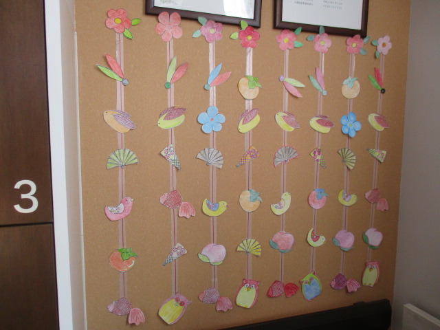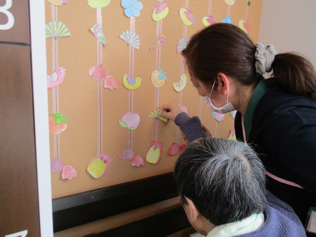 皆様に色付けをしていただいた「つるし雛」を貼っていきます。「ここにはこれを貼って・・・」と職員と話し合いをしながら決めていました。