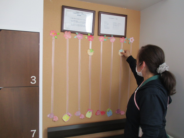 職員と一緒に玄関内の飾り付けのお手伝いをしてくれているS様^-^!一つ一つ順番に渡してくれています♪