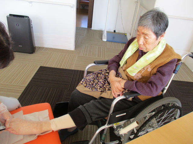 入浴後のS様、陽射しで気持ち良くなって「眠たいな」と話されておりましたが、お風呂でフットマッサージの後の爪のお手入れに…「スペシャルメニューだね。」*^-^*♪