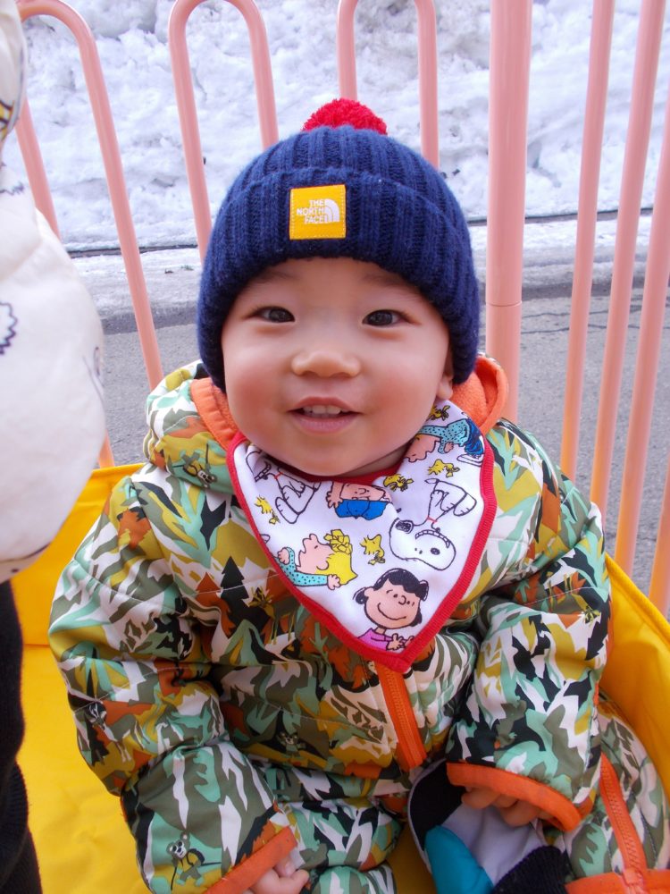 りすぐみの小さいお友達はお散歩カートに乗って…道路の雪も解け風をきって進むカートにご満悦のHくん♪