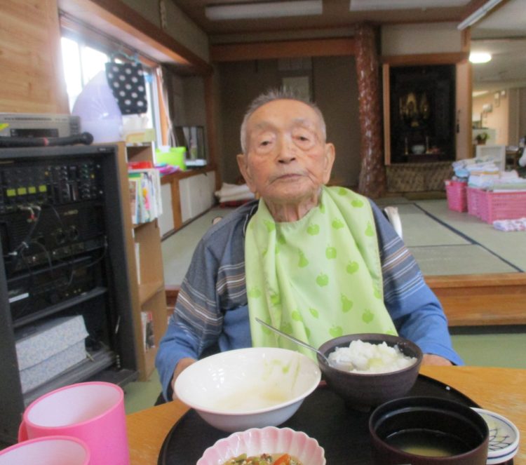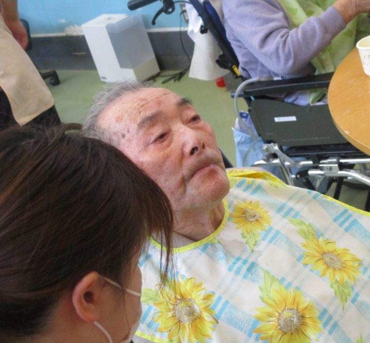 お食事中ににぎやかなN様です。まわりの職員に声をかけられ、陽気なご様子です。ご飯はマイペースに召し上がられるので、私達もお話しながらも少しずつ召し上がられるよう声掛けさせていただいております。
