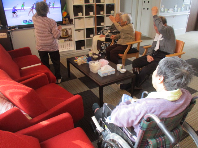 テレビでの動画を観ながら皆様と一緒に体操をしました♪「ほれ、こんだべ~^-^」と話されながら体操をしているT様。座りながらの体操でも体がポッカポカ!!