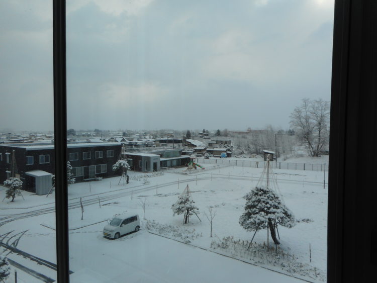 一枚目の写真は今朝の雪景色です。冬に戻ってしまいましたね。