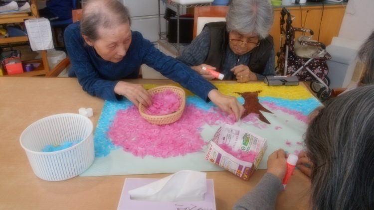 寒い外をよそに、ベルフラワーでは、桜の咲くのが待ち遠しく、皆さんで大きな桜の木のちぎり絵を作っています。