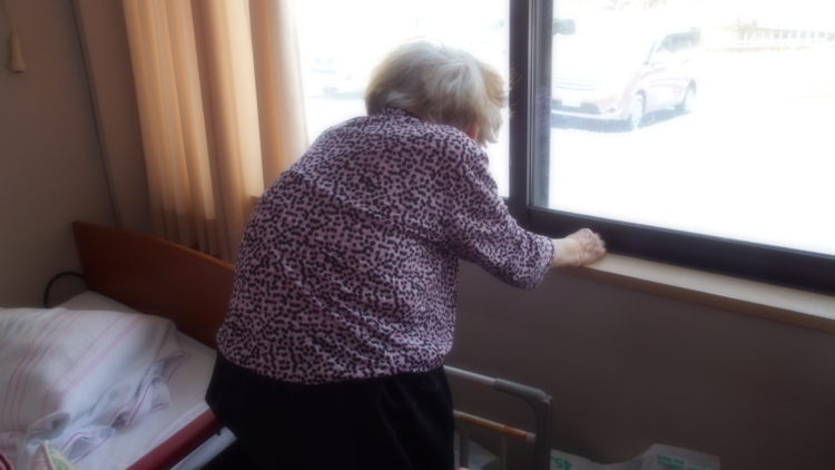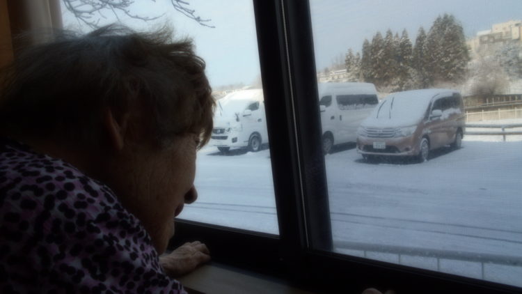 ベルフラワーのお客様H様に声を掛け「雪降って積もりましたよ~」と話すと景色が見たかったのか車椅子からつかまり立ちをし、窓から外の様子を眺めていました。