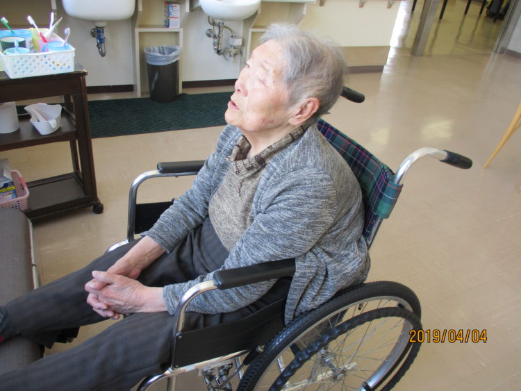 水分補給時にジュースとせんべいを1枚食べ「もう一枚食べれば元気になるな」と言い、もうすぐ「おいしい昼食きますよ」と伝えI様笑っている。