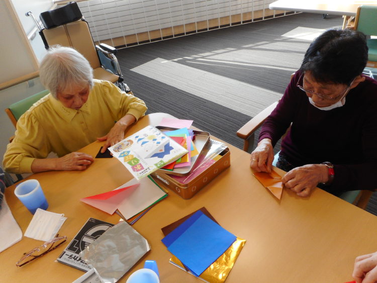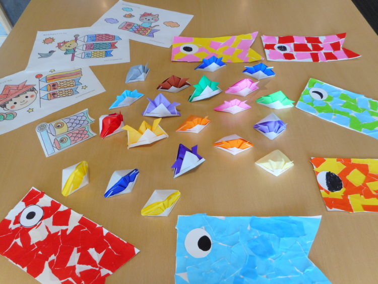 こどもの日が近づいてきましたので、こども達が元気に強く育って欲しいと願いを込めて、折り紙でかぶとを折りました。これまで、こいのぼりを貼り絵で作ったり、こどもの日の塗り絵を行ってきました。