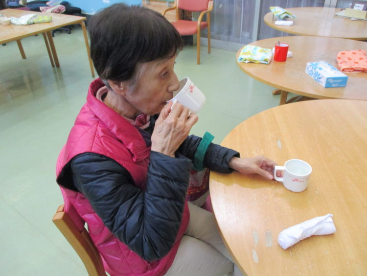 洗濯物を運び終わり、ジュースを飲むS様。「仕事した後のジュースが一番おいしいの」と笑っているS様でした。