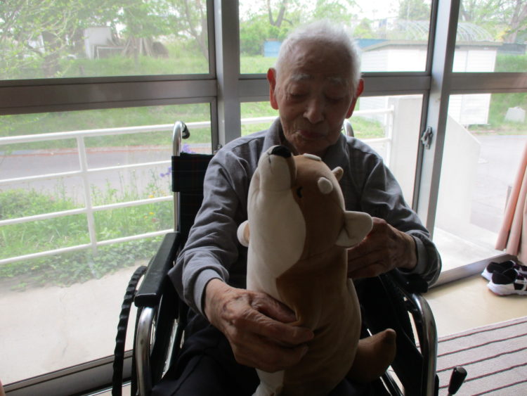 ご持参された犬のぬいぐるみを抱っこされ、一緒に離床されました。