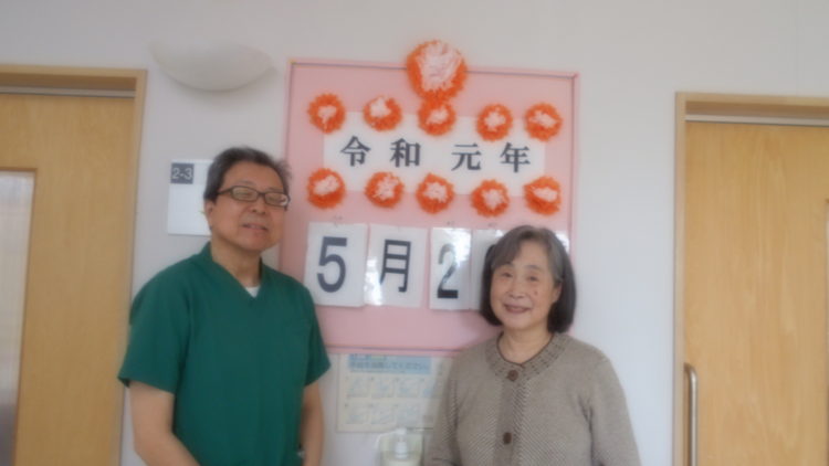 「令和元年」と書いた紙の周りをお花紙で綺麗に飾ってI管理者と一緒に「ハイ!ポーズ」(^^♪