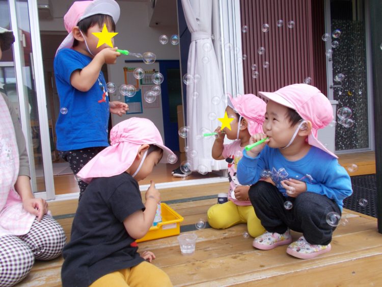 H君は保育者が吹いたしゃぼん玉をみてニッコリ(๑→ܫ←๑)