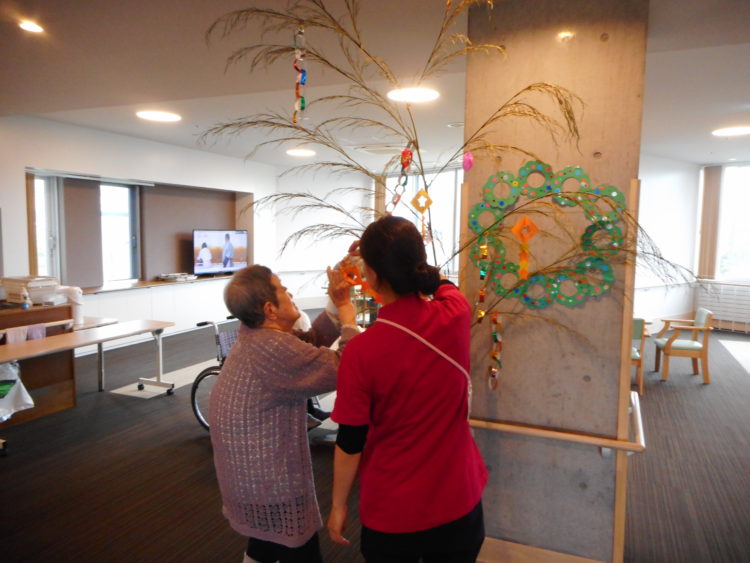 もうすぐ七夕という事で、2階ホールにて、お客様と一緒に七夕準備をしました。お客様各々願い事を書いて飾り付けしていました。散歩の途中にお客様が立ち止まりどんな願い事が書かれているかみたりして過ごされていました。先日九州地方で大雨によるニュースが多く取り上げられ、大事に至らない事を祈っています。