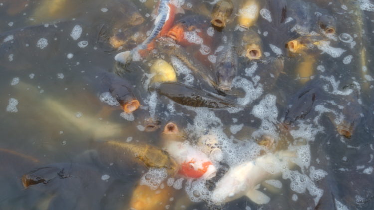 残念ながら、蓮の花はまだ、咲いていませんでしたが、池を悠然と泳いでいる鯉を見つけて大喜び! 餌をあげると、次々に寄ってきました。