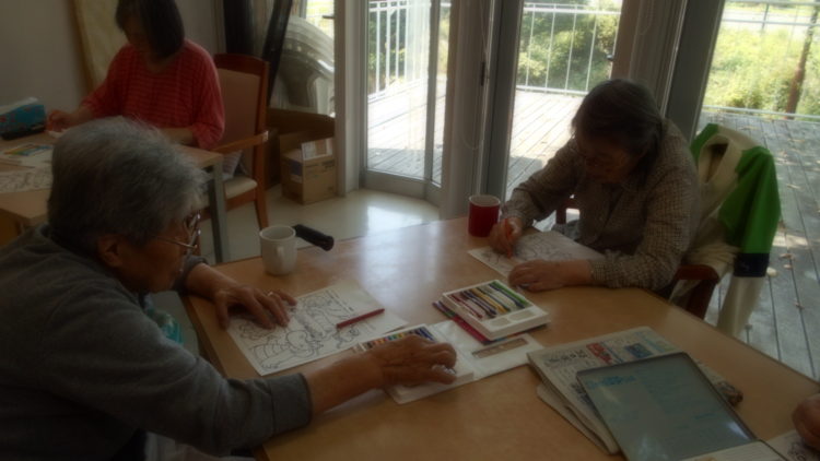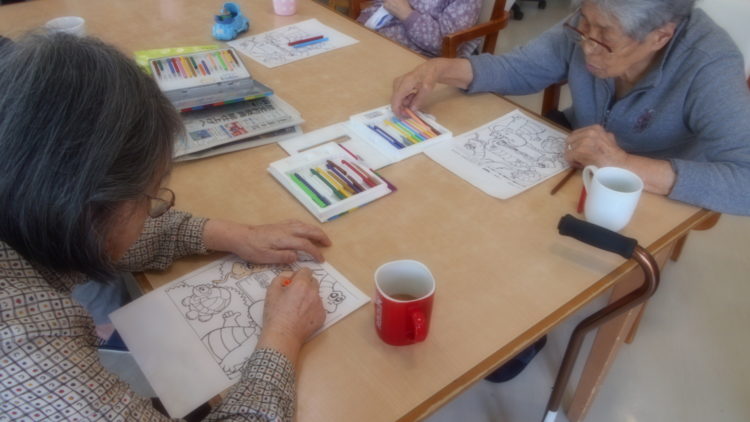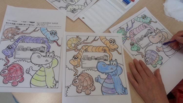 チラシの裏は爬虫類のイラストの塗り絵になっていました。「これなら、こわくないね。かわいいね」ということで、塗り絵に挑戦しました。