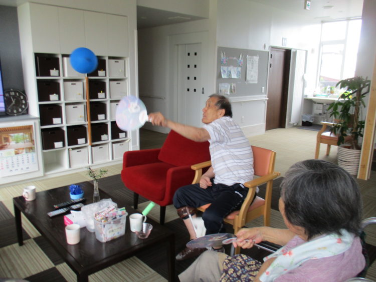 普段は、手で風船バレーを行うのですが、今回は、団扇を使って行いました♪
