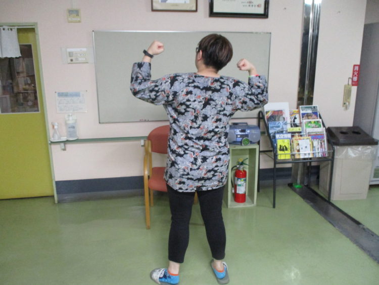 白シャツの二人は、囃子の笛を担当しているO介護士とM介護員です。半纏を着こなし、指の準備運動をしておりました。