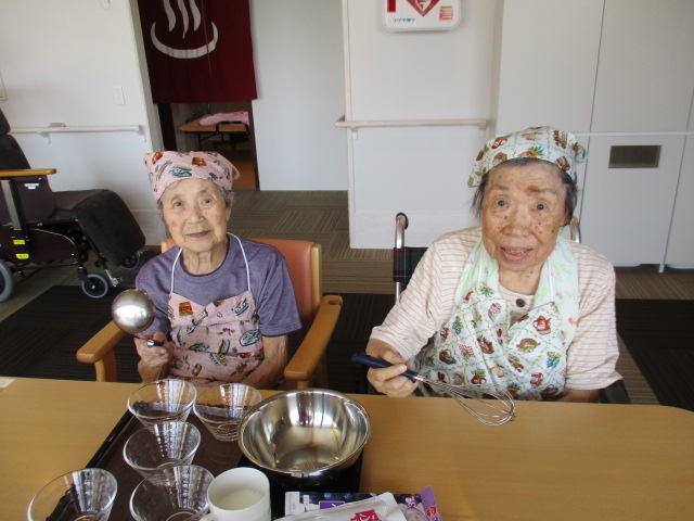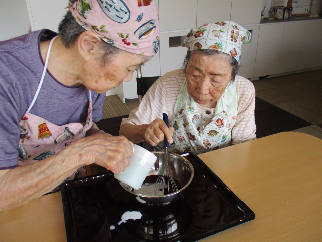 N様に牛乳を注いでもらい、S様にかき混ぜて貰い共同で調理をして頂きました。