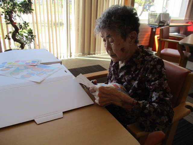 N様は入浴後、塗り絵ケース作成の為のパーツ作りをして頂きました。