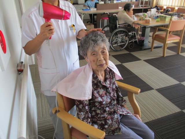 N様はお風呂上りで髪の乾燥中です。「お風呂良いね。サッパリする。」と笑顔で話してくださいました。