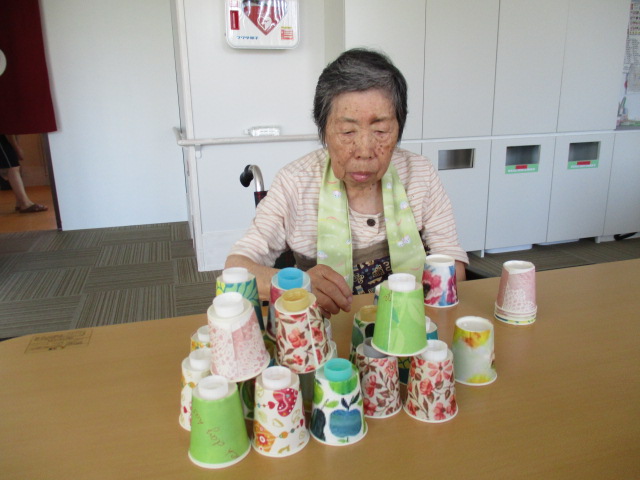 「孫と一緒にいるみたいで嬉しい」とS様。楽しく紙コップタワーを積み上げておりました。