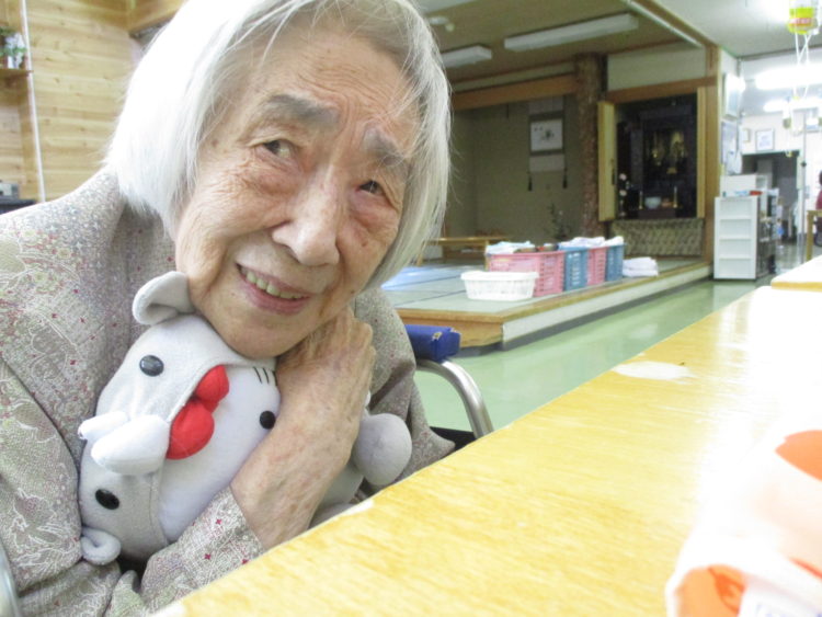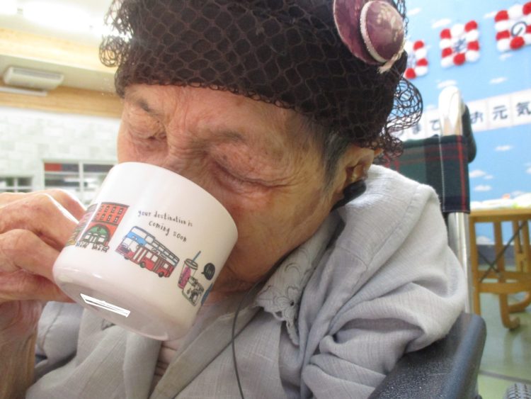 K様は温かい日差しの中こっくりこっくりとされておられました。お手洗いの時間になったので忍びなかったのですが、起きて頂き、喉が渇いたとおっしゃられたのでお茶をお出しして水分補給して頂きました。