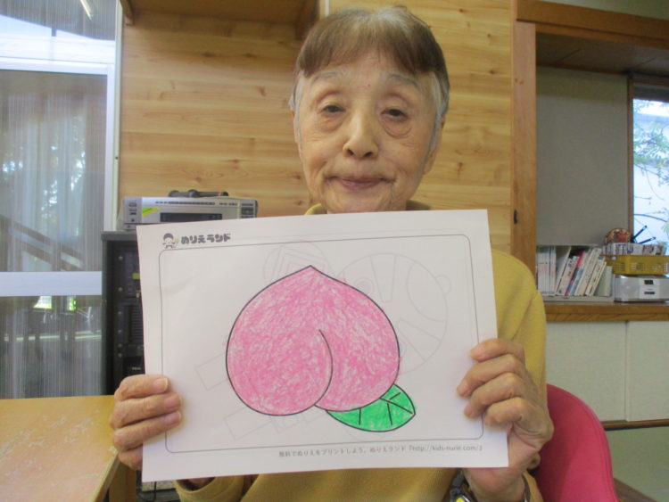 桃の塗り絵に丁寧に色付けをされていました。