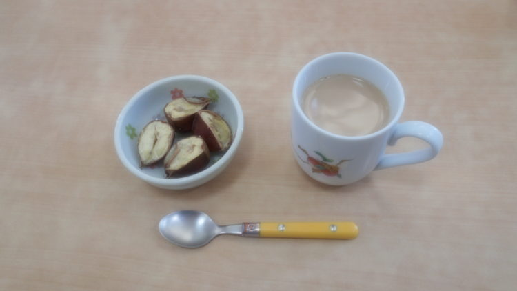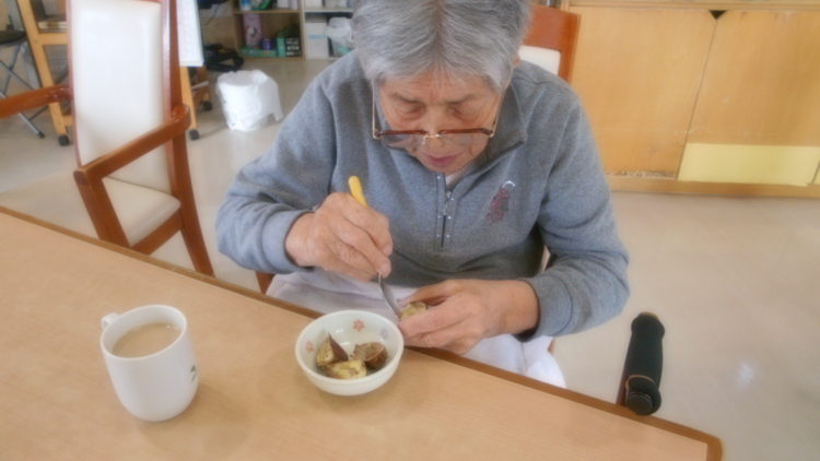 栗は半分に切ってスプーンですくって食べるのですが、最初のうちは上手くできなかったようです。それでも、少しづつすくって食べていました。皆さん集中して無口になっていました。