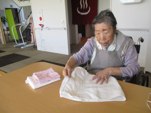 S様はお風呂から上がってきてから、自分から進んでタオルを畳んでくれました。ステキな笑顔もたくさん見られました。
