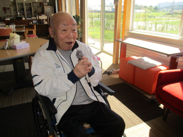K様は、午前に大好きなカラオケを行いました。歌った曲は、「小樽の人よ」「雨の港」「港町、涙町、別れ町」3曲歌ってくれました。楽しそうに歌っていました。歌を歌うことはいいこですね。また大好きな歌を私たちに聞かせてくださいね。