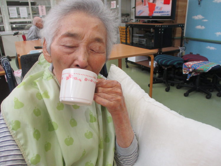 落ち着いたブルーのエプロンを着用されたN様は、ご自分でお食事を美味しそうに召し上がる方です。またジュースなどはとてもお好みのようで人一倍お召し上がりになります。