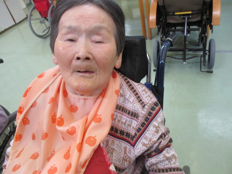 緑色のエプロンのN様はご自分でトロミの付いた水分を召し上がる方です。食事は全部美味しそうに召し上がり、最近は体調もとても良さそうです。ご飯をしっかり摂って長生きなさってください。