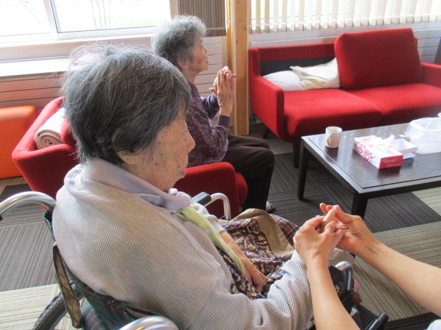 次は脳活性化のツボ押しと嚥下体操です。都度体調を伺いながら行いました。
