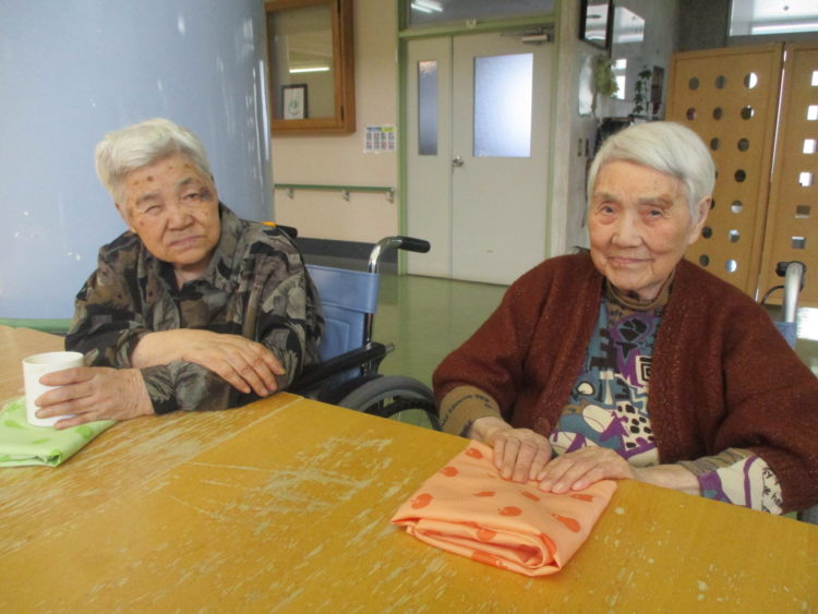 エプロンを全て畳み終わった後、エプロンを使うお客様に配っていきます。丁寧に畳まれたエプロンを渡されたM様とK様。M様達から「ありがとうね」と話されたS様はとても嬉しそうに笑っておりました。