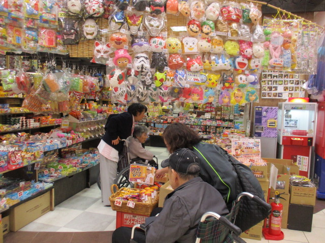 ”だがしや”にも行ってみました。昔懐かしい駄菓子が並び「コレ昔、こんなにしたべがのー」と言う会話をしながら、しばらく滞在。その後ダイソーにも行ってみました。品数の多さに驚いていました。