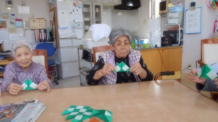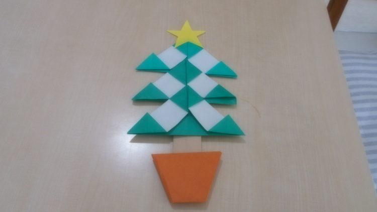 ベルフラワーでも、クリスマス飾りの準備をはじめました。まずは、折り紙でクリスマスツリーを製作中です。