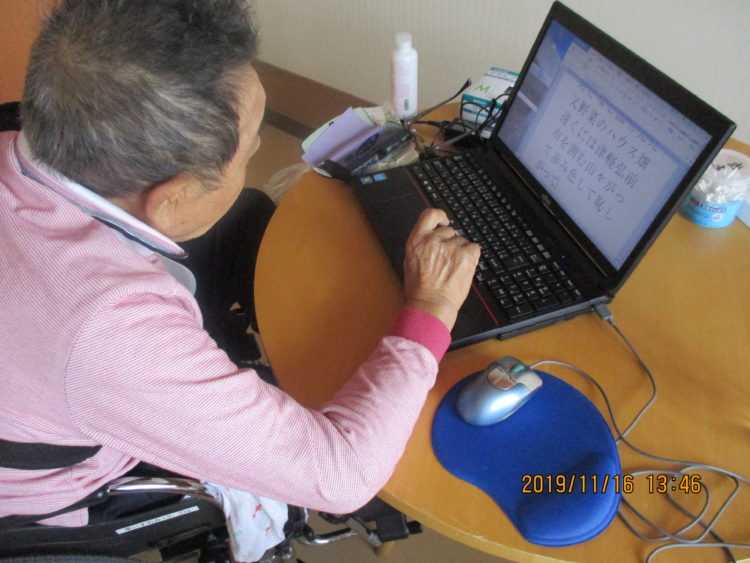 お家からパソコンを持ってきており、時間があると居室に行ってパソコンをしています。ご本人も「パソコンをしていると楽しいんだ」と話されています。