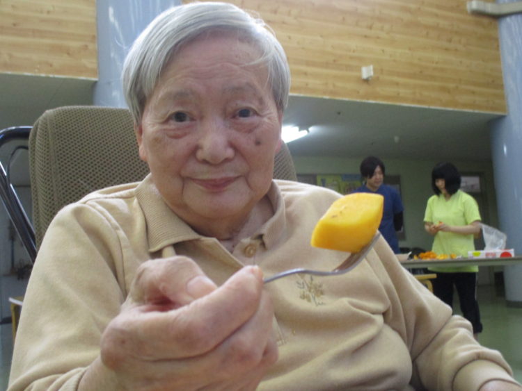 柿を見て嬉しそうなM様。食べてみて「とても美味しい!」と話され、あっという間にお皿に入っていた柿をぺろりと食べてしまいました。