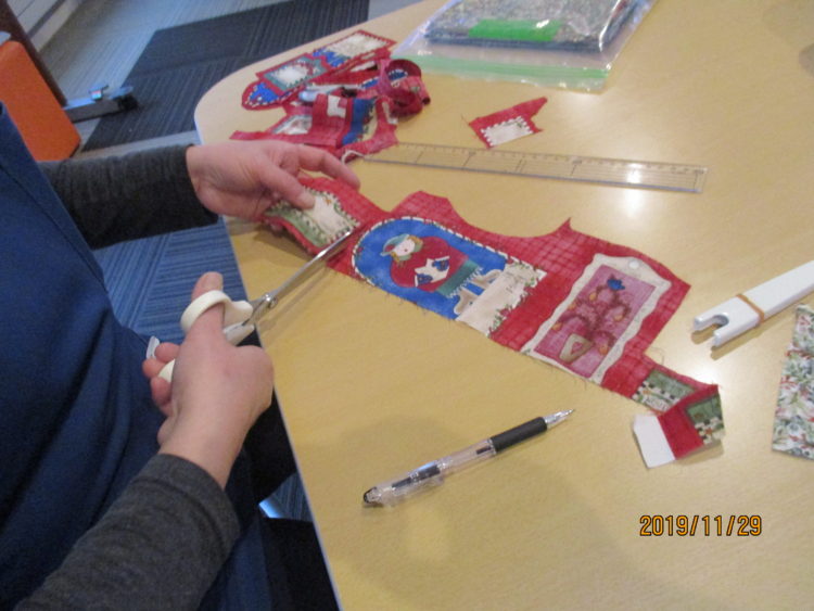昨日S職員がクリスマス柄の生地を切り、本日の為に準備を行いました。