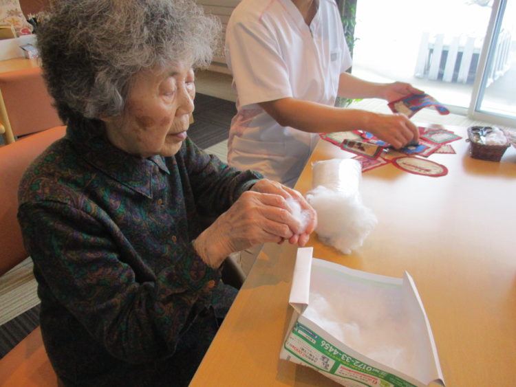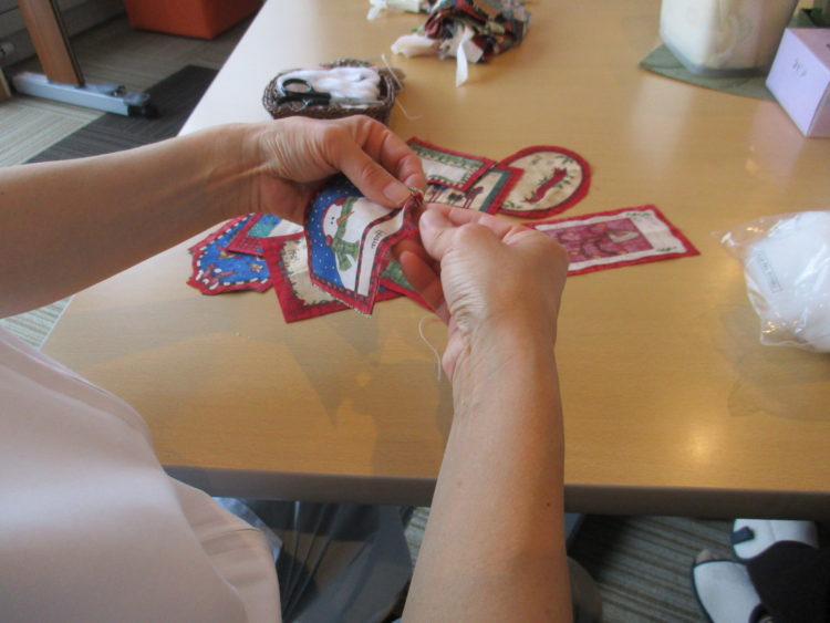 T看護師がN様と一緒に昨日切った生地を縫い合わせています。こちらを何枚も作成しています。