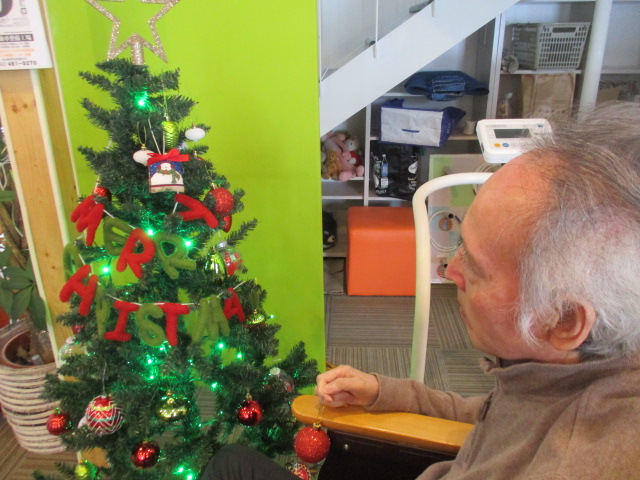 S様に「ツリーの飾り付けしました。キレイですね」と声掛けすると笑顔で「うん」と答えて下さいました。
