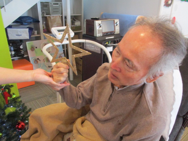 入浴され昼食までの時間は、休まれている事の多いS様が暫くツリーを眺めて居たので目線を辿るとツリーの上の星が気になっていた様です。