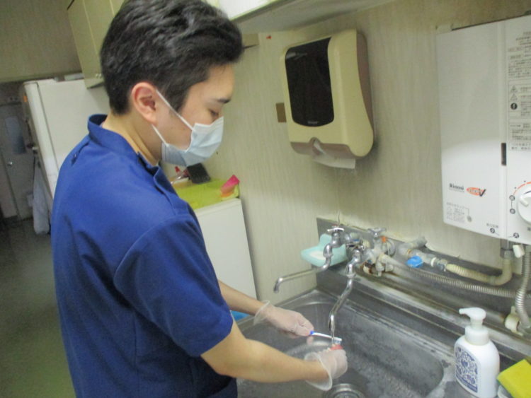 食事が終わった後、職員がお客様の入れ歯を洗浄しています。お客様が気持ち良く使って頂く為に気持ちを込めて慎重に洗っています。