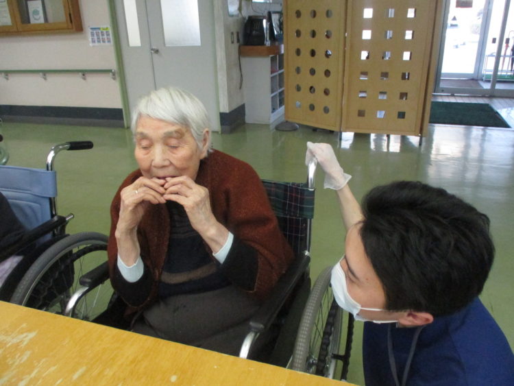 今度は洗い終わった入れ歯をお客様にはめてもらいます。ちゃんとはまっているか職員も確認しています。