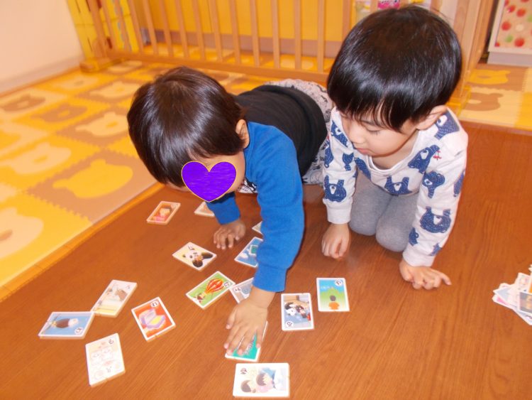 保育者が読み上げた物と同じ絵を探し、「はいっ!」と元気よく取っていました☆