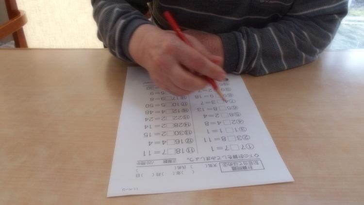 今日は、計算の脳トレを行ない、頭の体操に取り組んでいただきました。